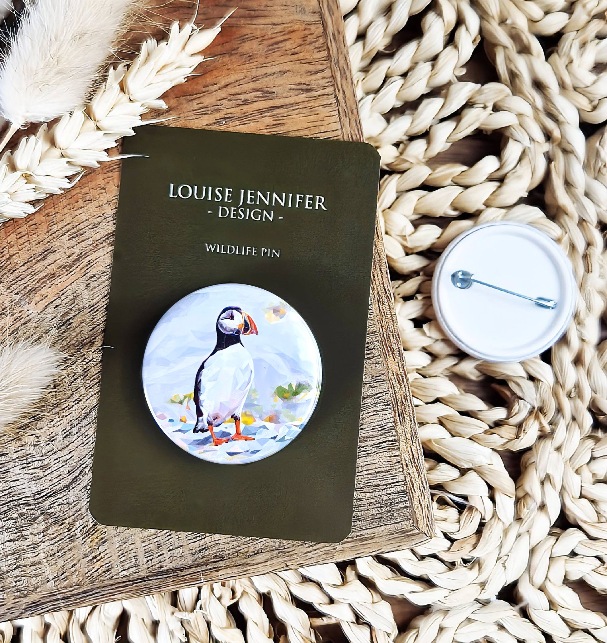 Brighten up your wardrobe with this cheerful wildlife pin badge, featuring a quirky Atlantic puffin in amongst a stunning coastal backdrop of blues, greys and greens .