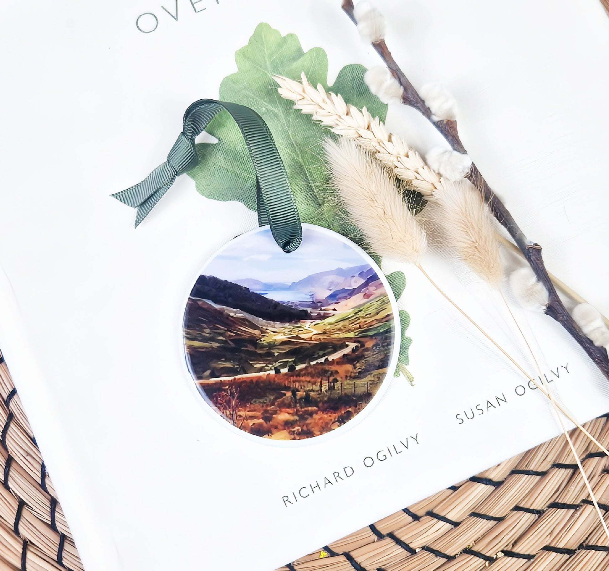A beautifully illustrated Scottish highlands hanging decoration featuring a stunning landscape view of Glen Docherty looking towards Loch Maree. The breathtaking hues of greens, blues and orange mix with the textures of the damp grass and soft heather tones.