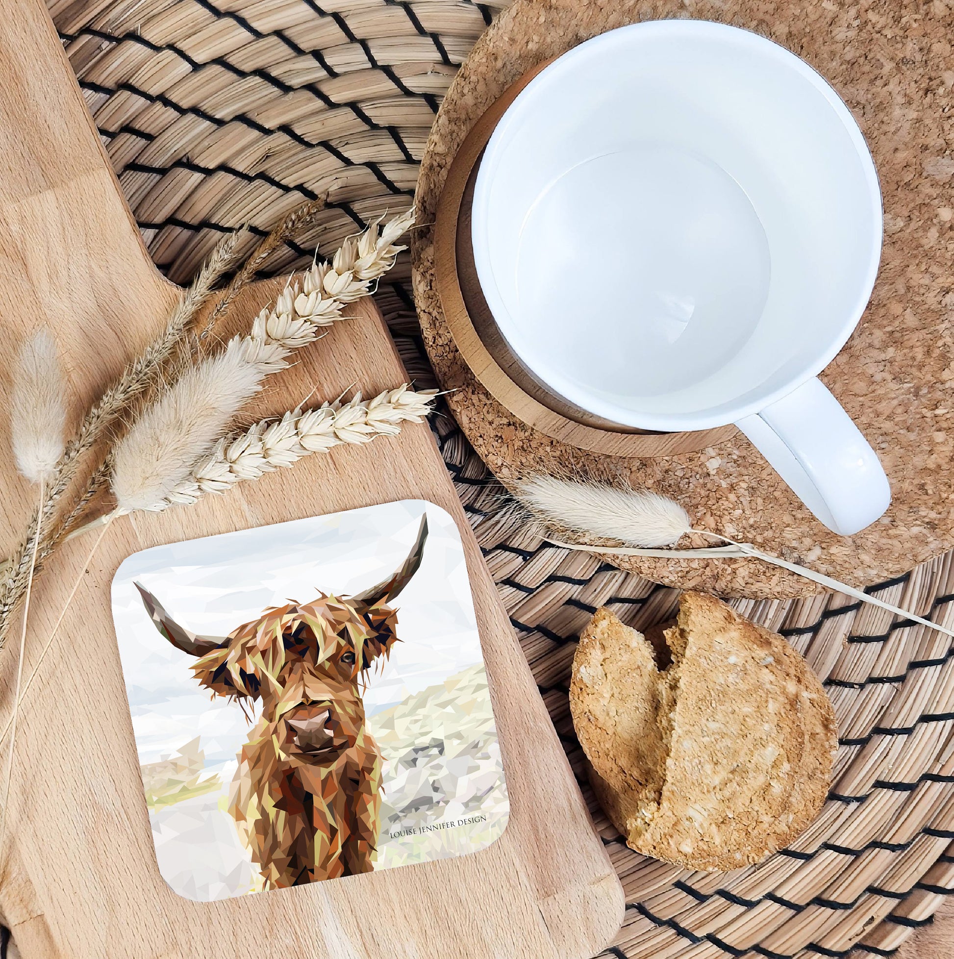 Highland cow drinks coaster | Geometric illustration | Scottish wildlife