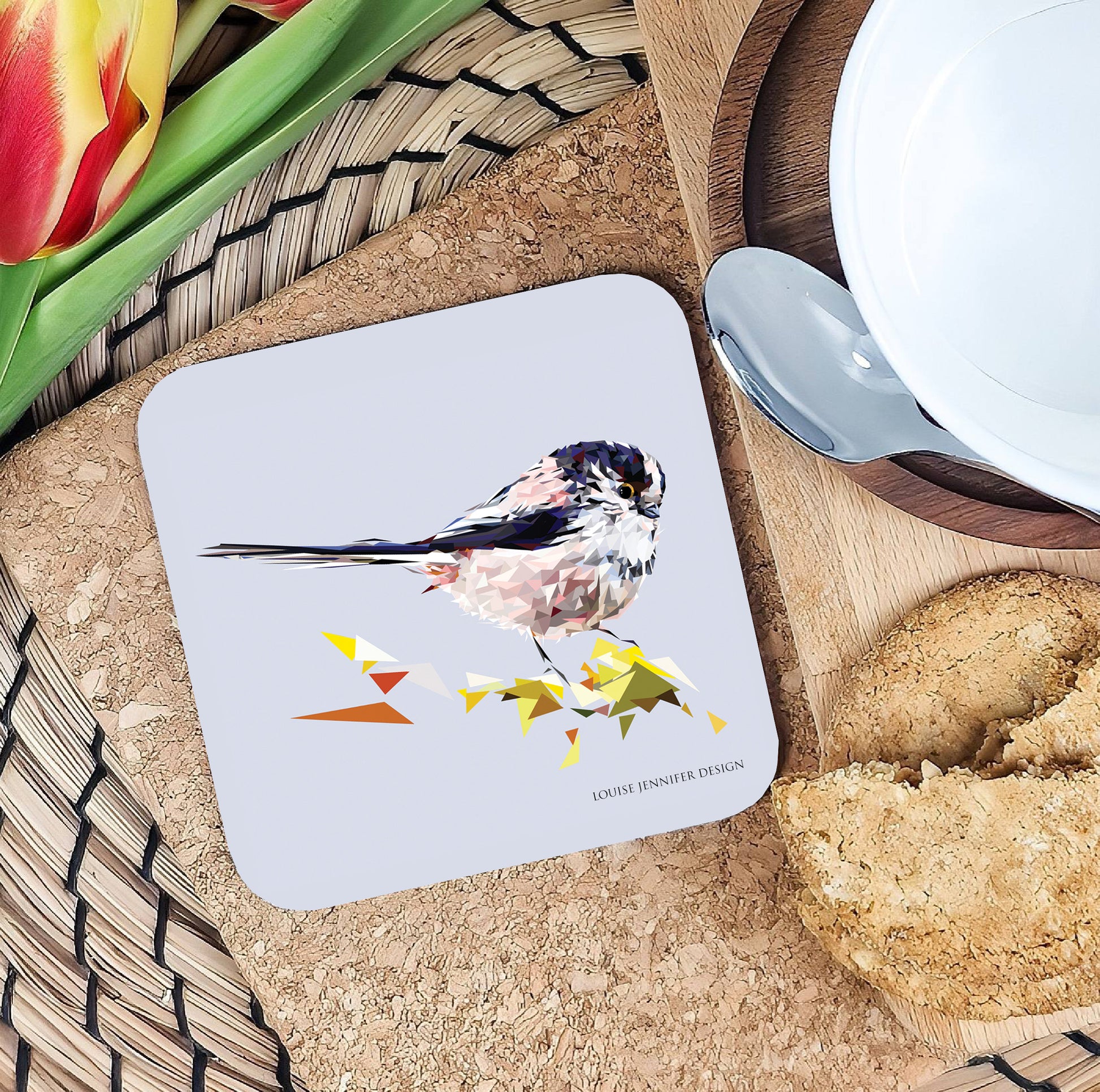 Long-tailed tit drinks coaster | Geometric illustration | Garden birds
