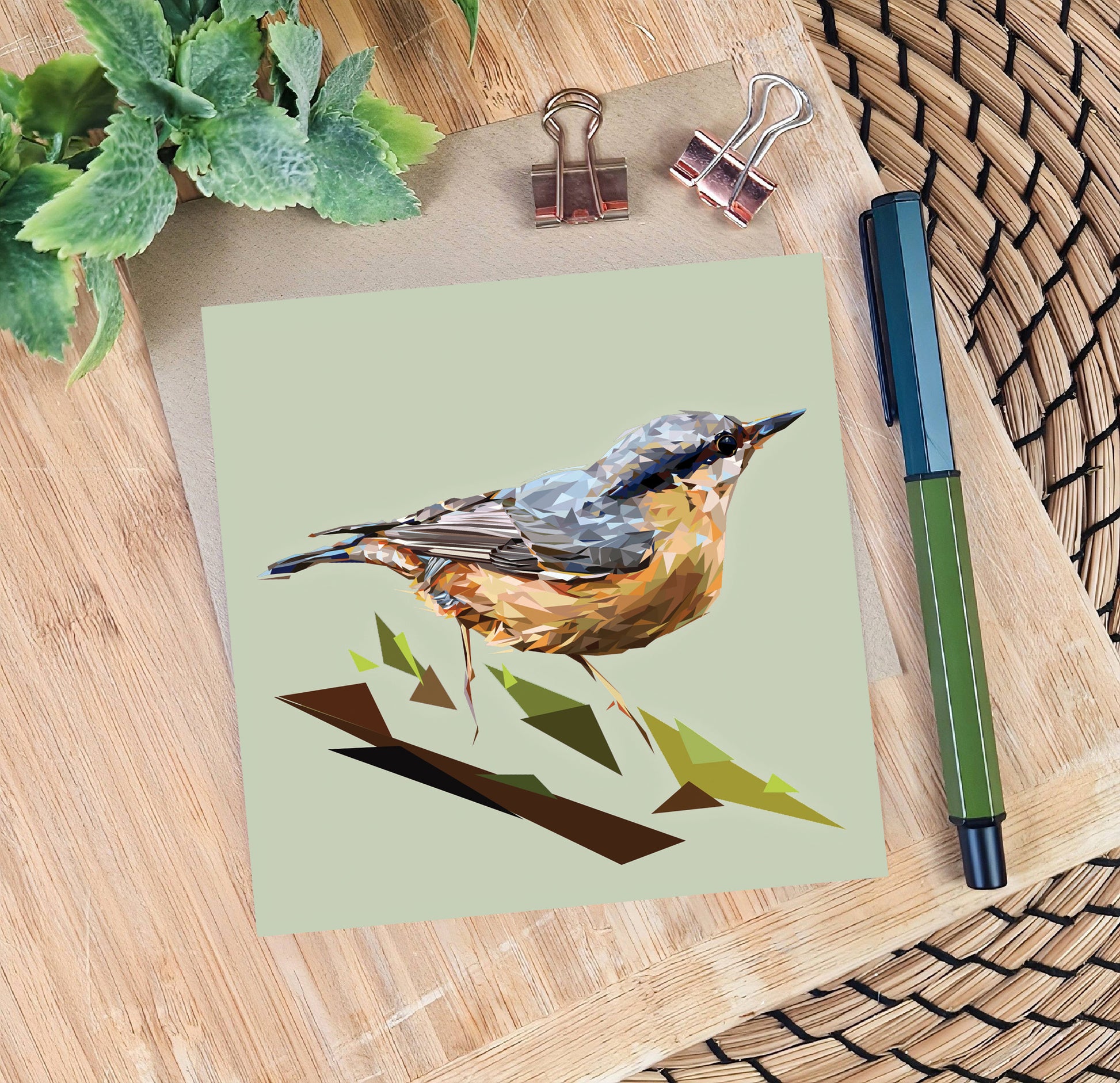 A beautifully illustrated British wildlife card featuring a vibrant nuthatch garden bird on a background of flat colour.