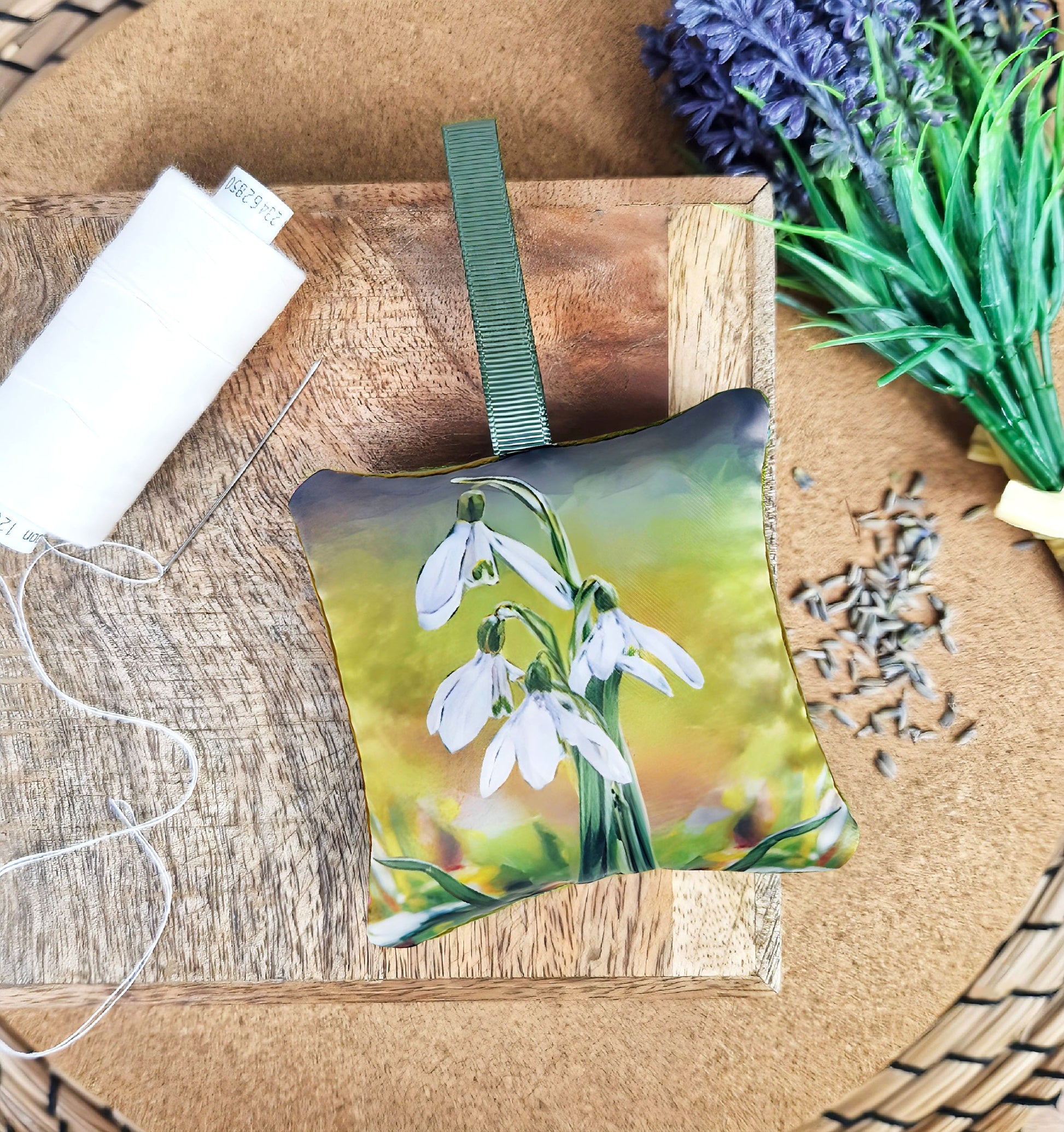 This listing is for a beautiful snowdrop flower illustration lavender sachet. The design is digitally printed onto beautiful classic 226gsm Duchess satin, a high quality fabric with a slight sheen, which allows the bright vivid colours to really pop! The backing fabric of each sachet is soft felt in a moss green tone, finished with an olive green grosgrain ribbon hanger. Each sachet is filled with quality British grown lavender which is renowned for its calming, aromatic properties, widely used to reduce stress, anxiety and promote better sleep.