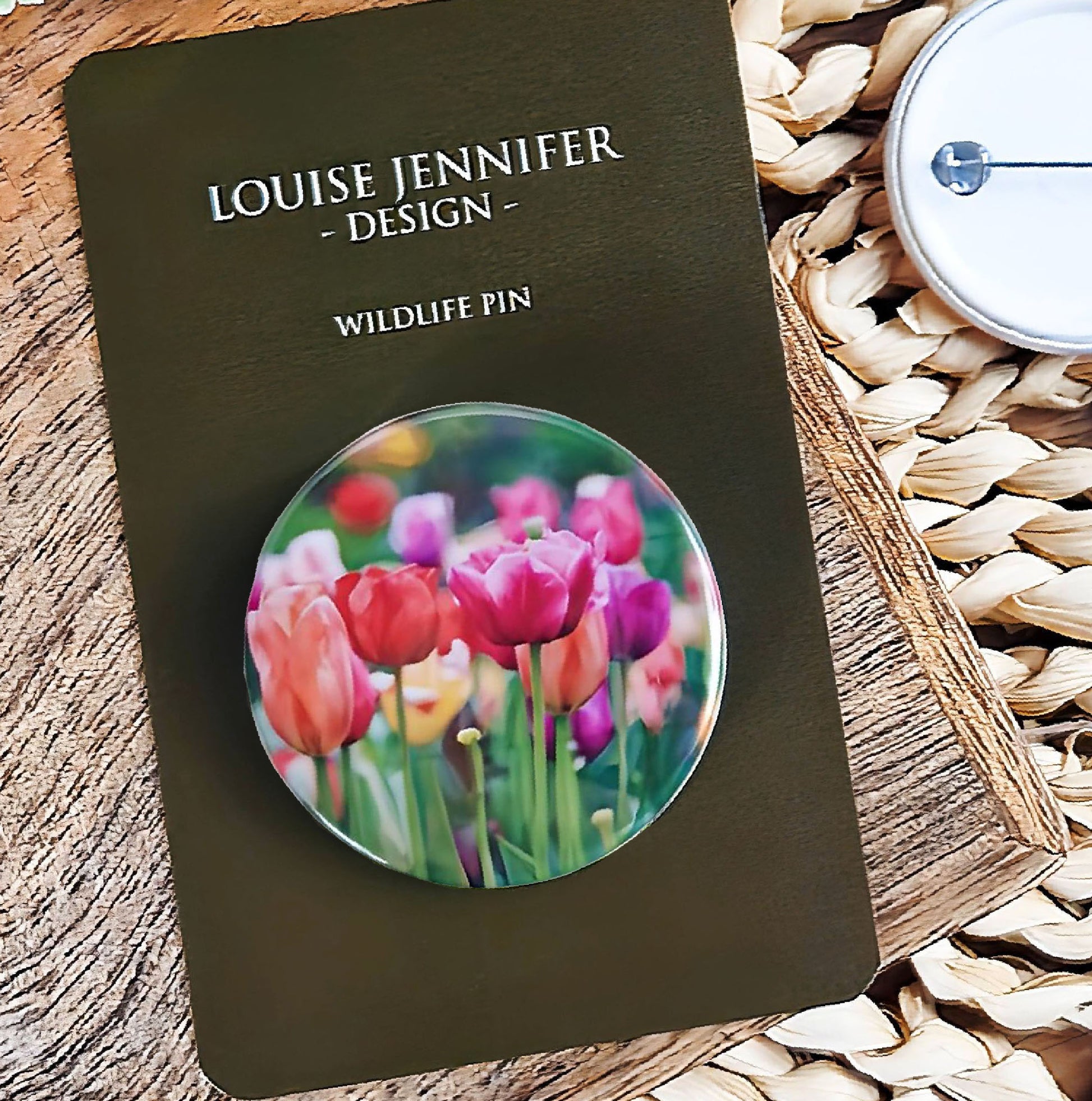 Brighten up your wardrobe with this cheerful wildlife pin badge, featuring delicate tulip flowers in amongst a backdrop of stunning yellow and green hues.